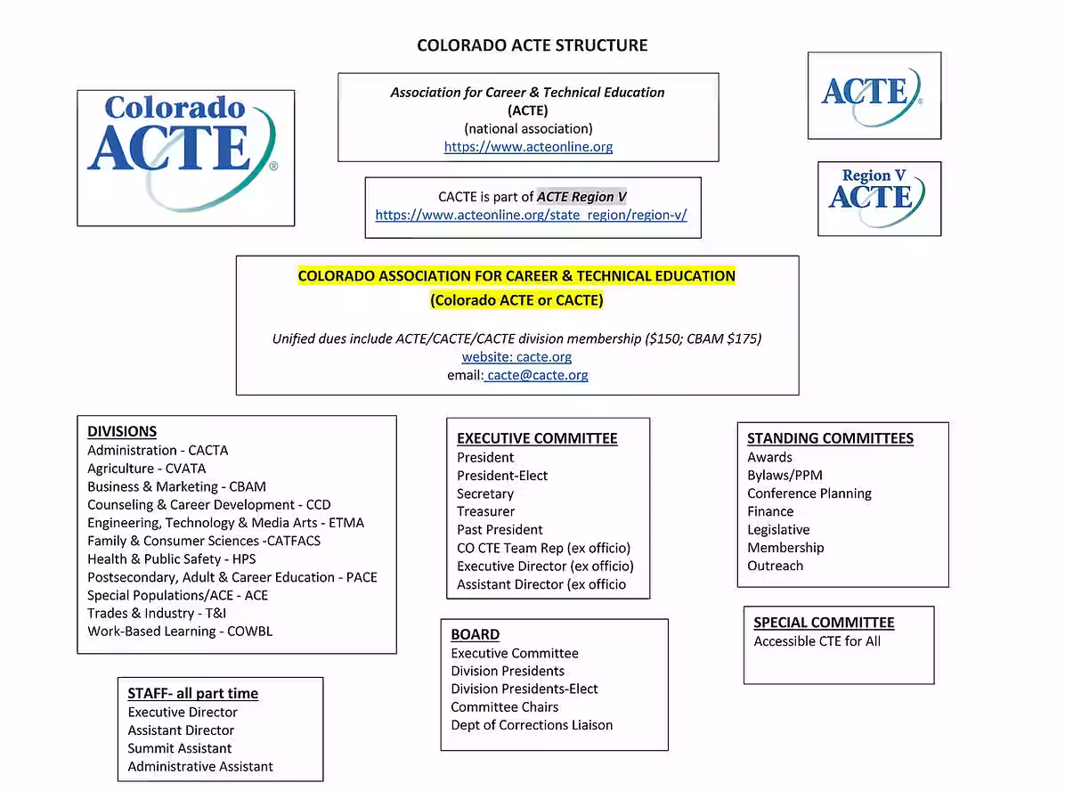 The CACTE Board is composed of the CACTE Executive Committee (elected officers), the Division presidents and presidents-elect, CACTE Committee Chairs, and Liaisons.